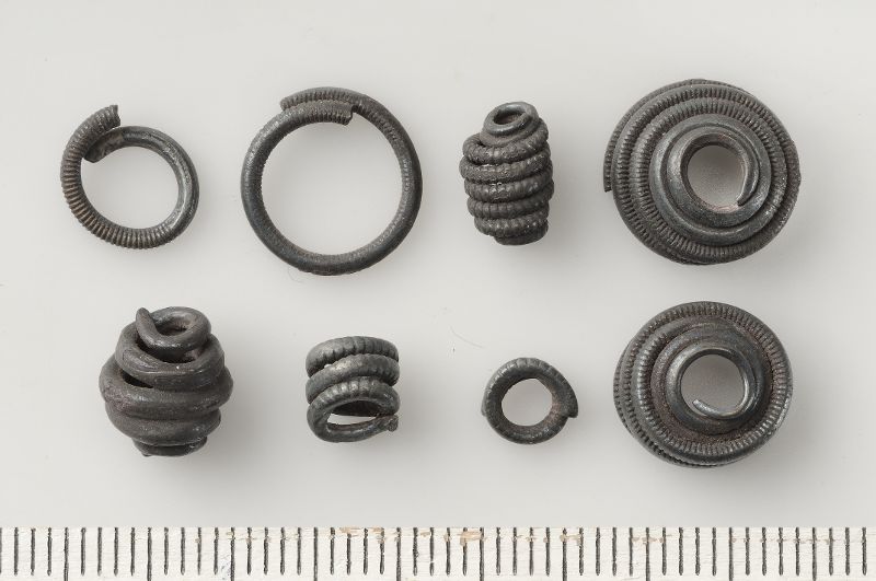 Finns pärlor av spirallagda silvertrådar (7- av räfflande trådar), 2 hela och fragment minst av 4 pärlor
