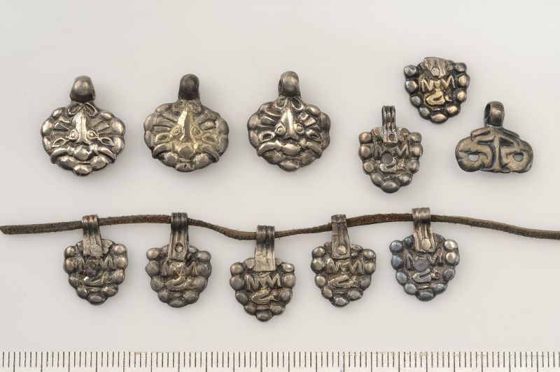 4 hängen och 1 fragment av hängögla till ett av de beslagen med sittande kvinnofigur.