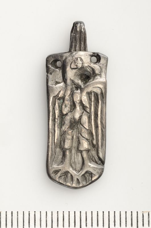 Rektangulärt hänget med fågelmotiv. Hänget omgjort av remändebeslag.