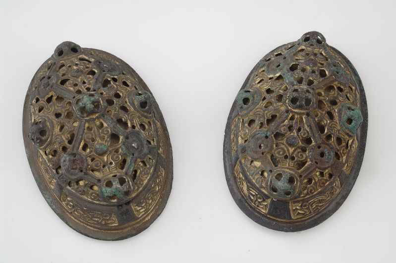spänne (oval spännbuckla, p 51) av brons, förgyllning, järn, textil