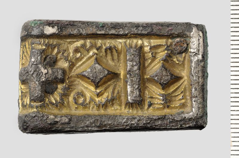 Rektangulärt spänne med nålhållare och nålfäste av brons, nålen saknas.