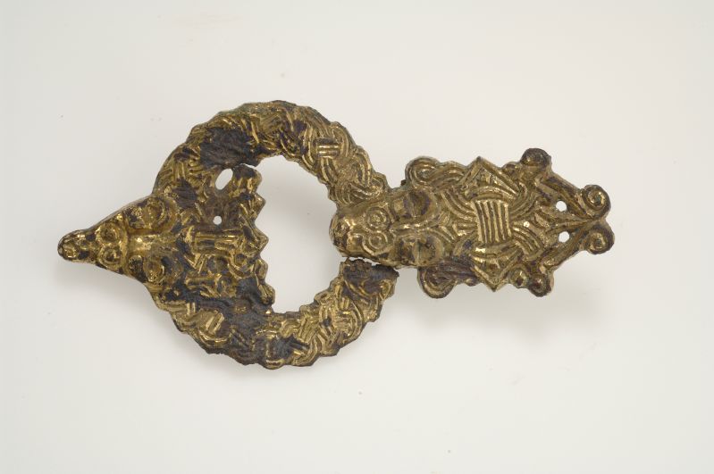 Ringspänne i borrestil av förgyllt brons. Nålen av överfångsgjutet järn saknas.