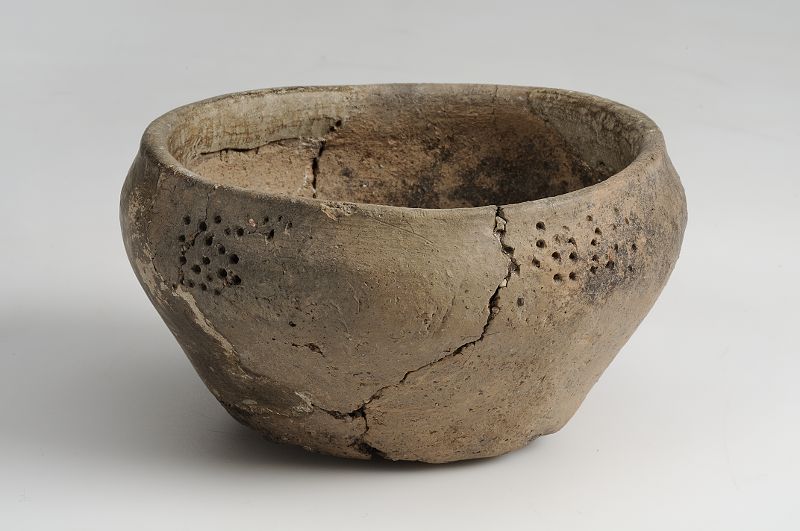 Litet kärl med dekor av intryckta punkter i grupper. Höjd 6 cm, diameter 10,6 cm.