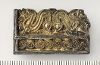 Rektangulärt silverspänne med förgyllning - ursprungligen en avhuggen del av ett FVT reliefspänne. Spår av pålödd nålanordning med järnnål på frånsidan.