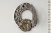 Runt silverbeslag med förgyllt, filigranornerat mittparti. Har varit fixerat med 4 nitar. Möjligen urspr ett hänge.