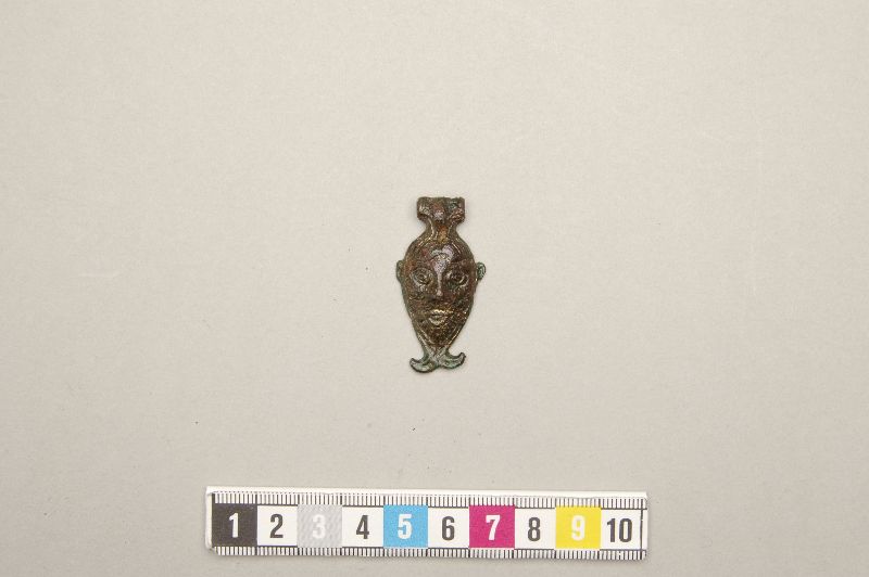 - pendant, shaped as a face, bronze, copper alloy, gilded