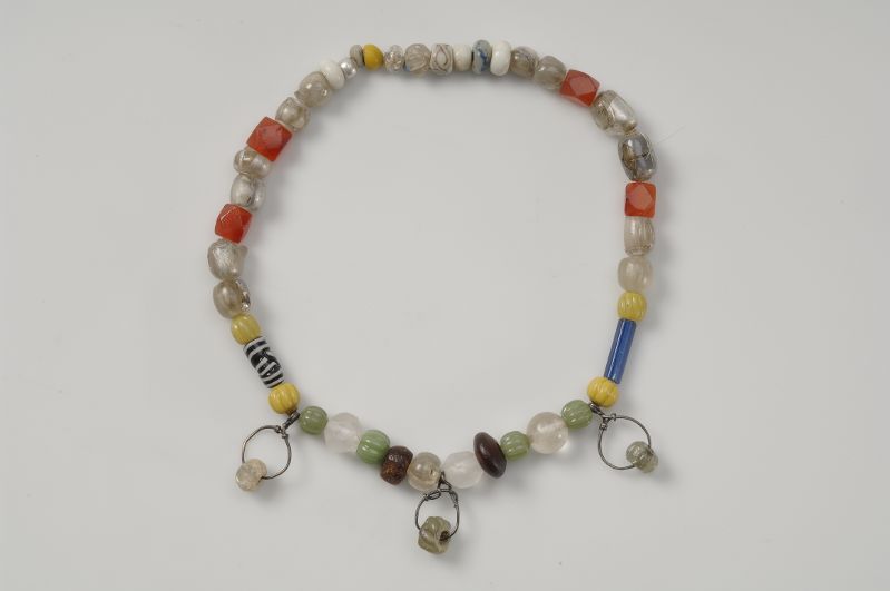 41 pärlor och 3 pärlhängen (av silvertråd). 4 av karneol, 3 av bergkristall, 2 av bärnsten övriga av glas ( av vilka 13 är silverfolierade).
