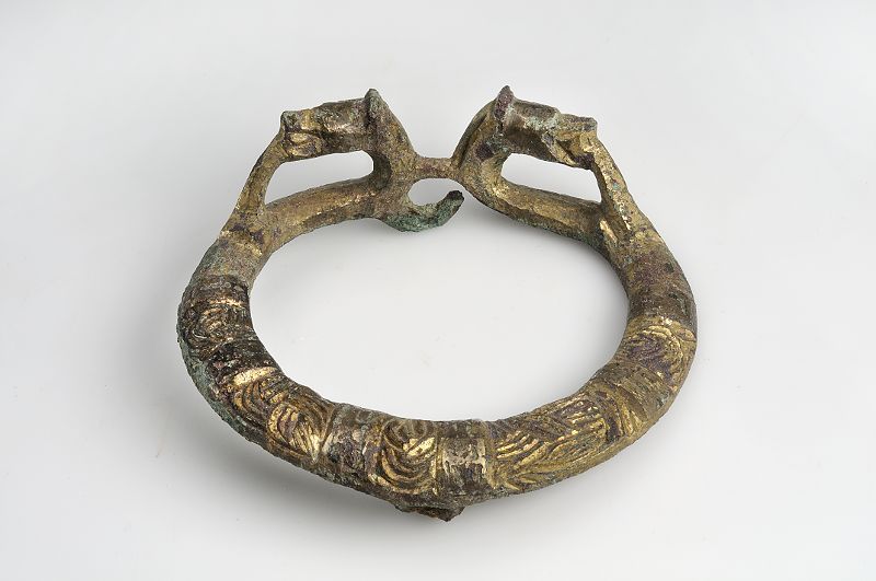 Ringnål i förgylld brons. Nålen avbruten vid fästet (saknas). Har 2 "falska" ändar (för att likna ett ringspänne) prydda med drakhuvuden.