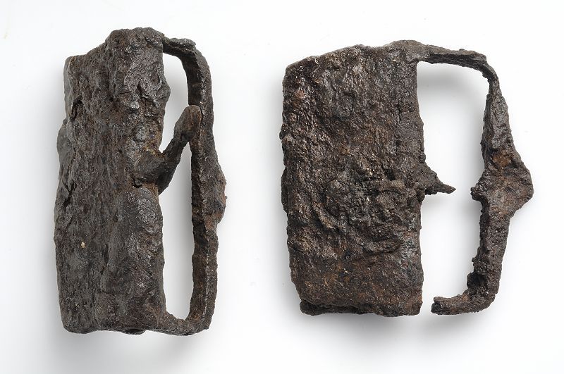 2 stora remsöljor av järn med spår av vitmetallbeläggning.