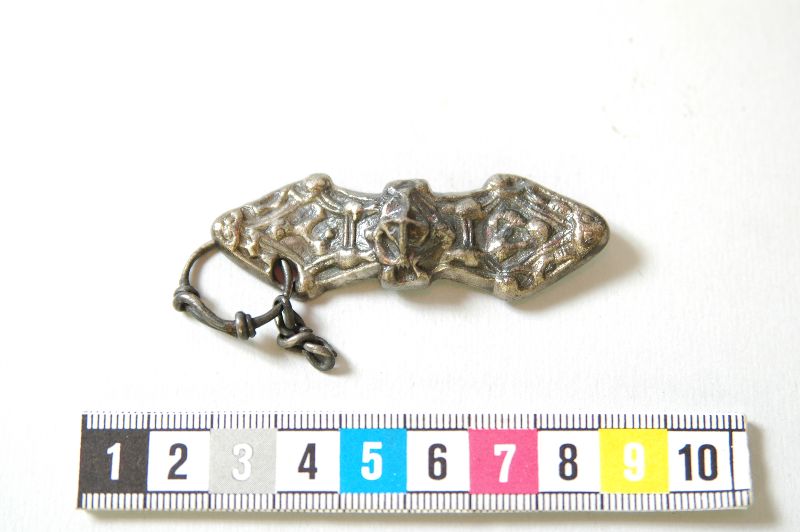 - Jmf. Birka I, Taf. 77:2. Mycket pekar på att det är ett till hänge omgjort spänne.
